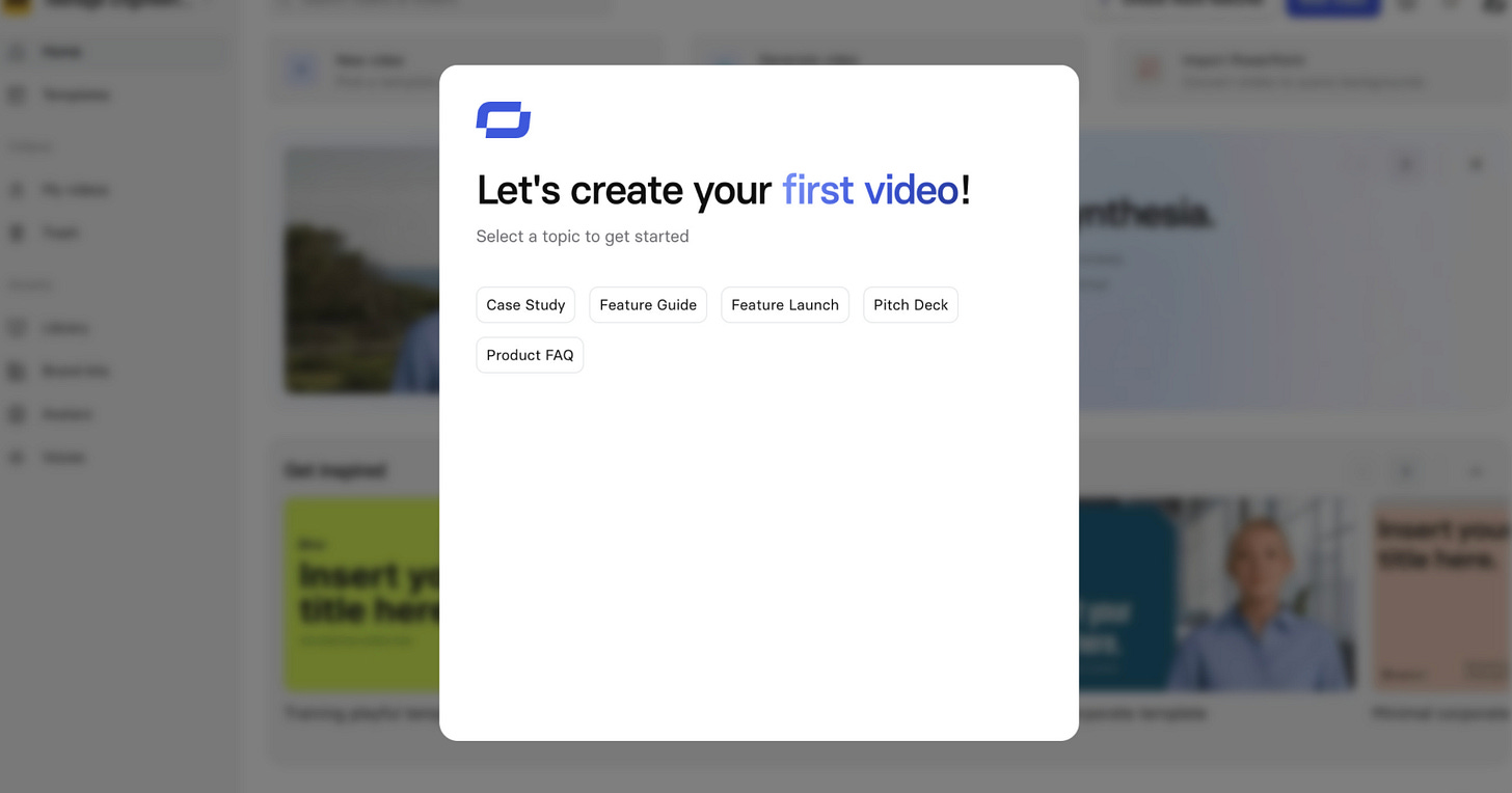 Synthesia does this well, asking basic questions about role and goal and then provide easy start tasks.