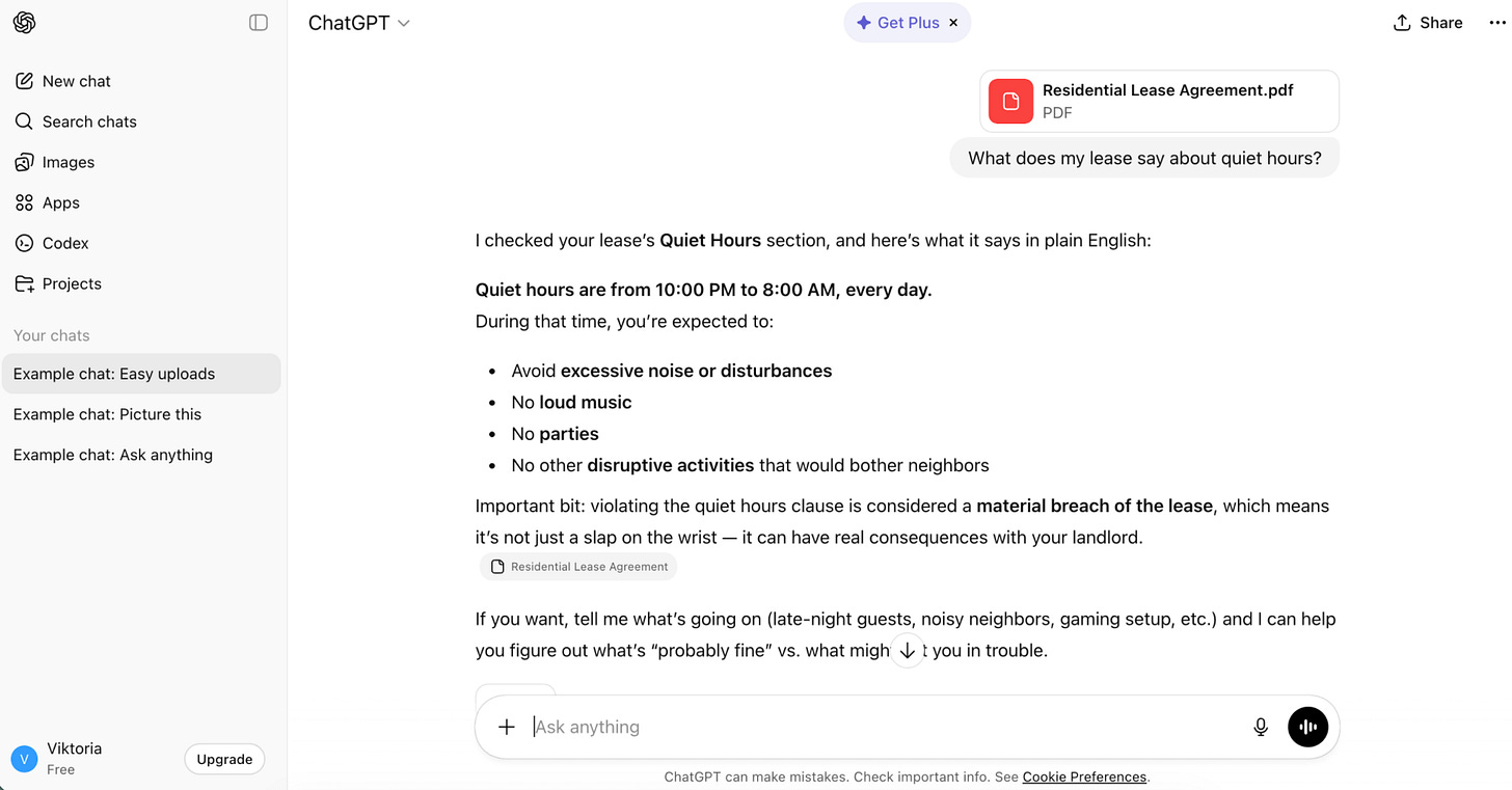 ChatGPT shows pre-made chats that help users quickly understand what a good prompt looks like and start interacting immediately.