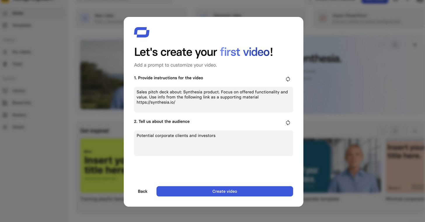 Synthesia with premade prompt for your video, so there is no need to write it from scratch, you can fix detail in 10 seconds and launch generation!