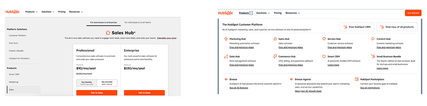 I’ve been working on this topic for years, and I still haven’t seen it done better than HubSpot. When you look across touchpoints, there’s a consistent taxonomy: Platform > Product > Features, and it’s easy to see how they slot actual functionality into each category.