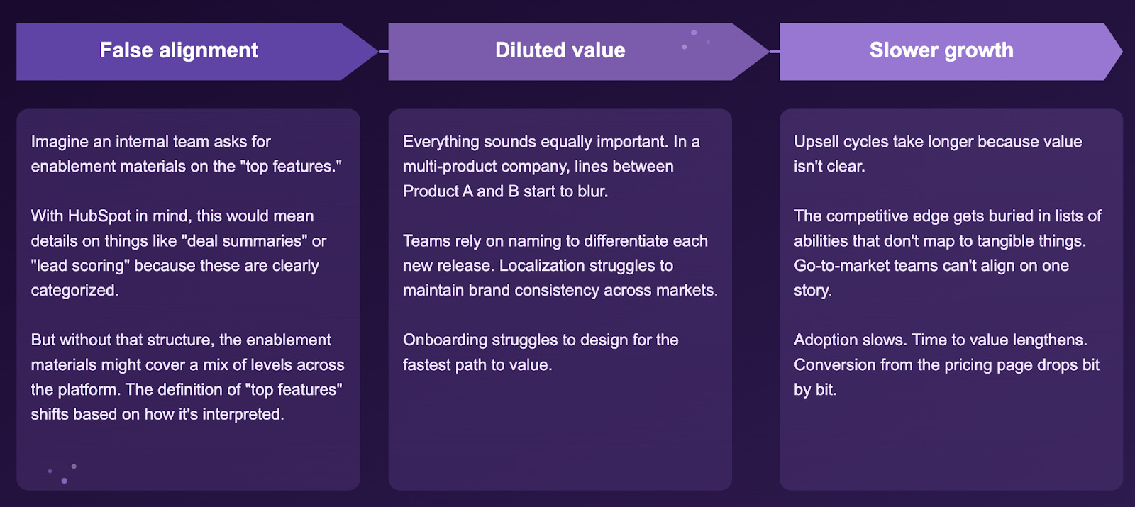 But when new or growing companies jump right into optimizing and flywheeling without clearly defining what their thing is or how it’s structured, growth potential gets limited and clarity debt builds. Positioning isn’t as clear, packaging might not click, and naming could spiral out of control with every new release.