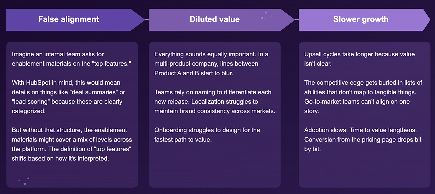 Confusion costs money. Without a shared way to classify what you build, more than just user understanding breaks down. It trickles into your operations, knowledge management, research studies, GTM release tiers, localization strategy, and more. When this kind of deliberate structure isn’t adopted and democratized, a lot can go wrong.