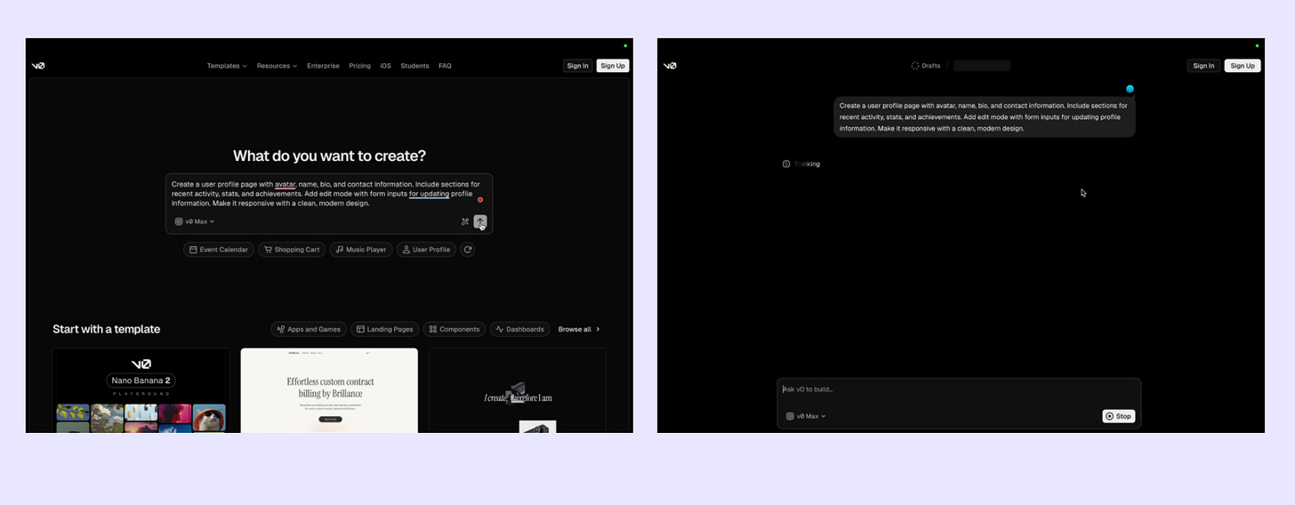 V0 starts generating the first outcome without asking you to sign up after the prompt 🤓. 4/6 AI tools asked me to sign up immediately, but V0 is not interrupting the first time to value. Their sign-up flow is almost invisible, with only 3 simple steps.
